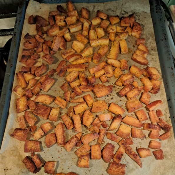 Leg alle korsten op een bakplaat (met bakpapier) en strooi dan de overige kruiden de broodkorsten. Op de plaat nog een keer mengen.