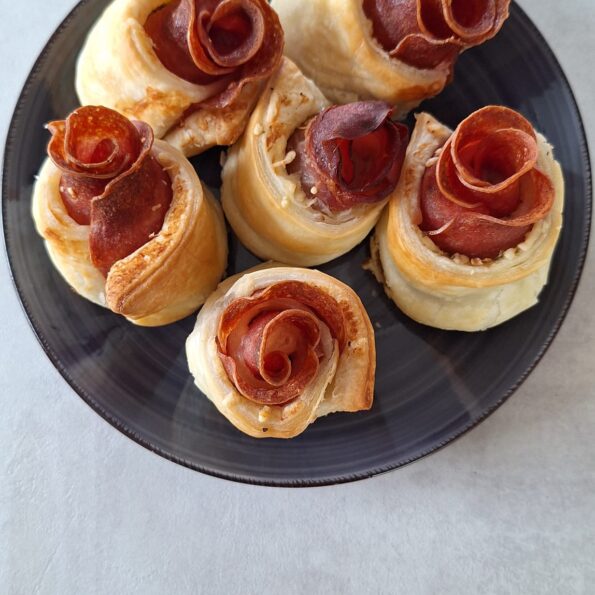 Leg 3 plakken salami per reep. Leg de salami half op de bladerdeeg en half er naast.